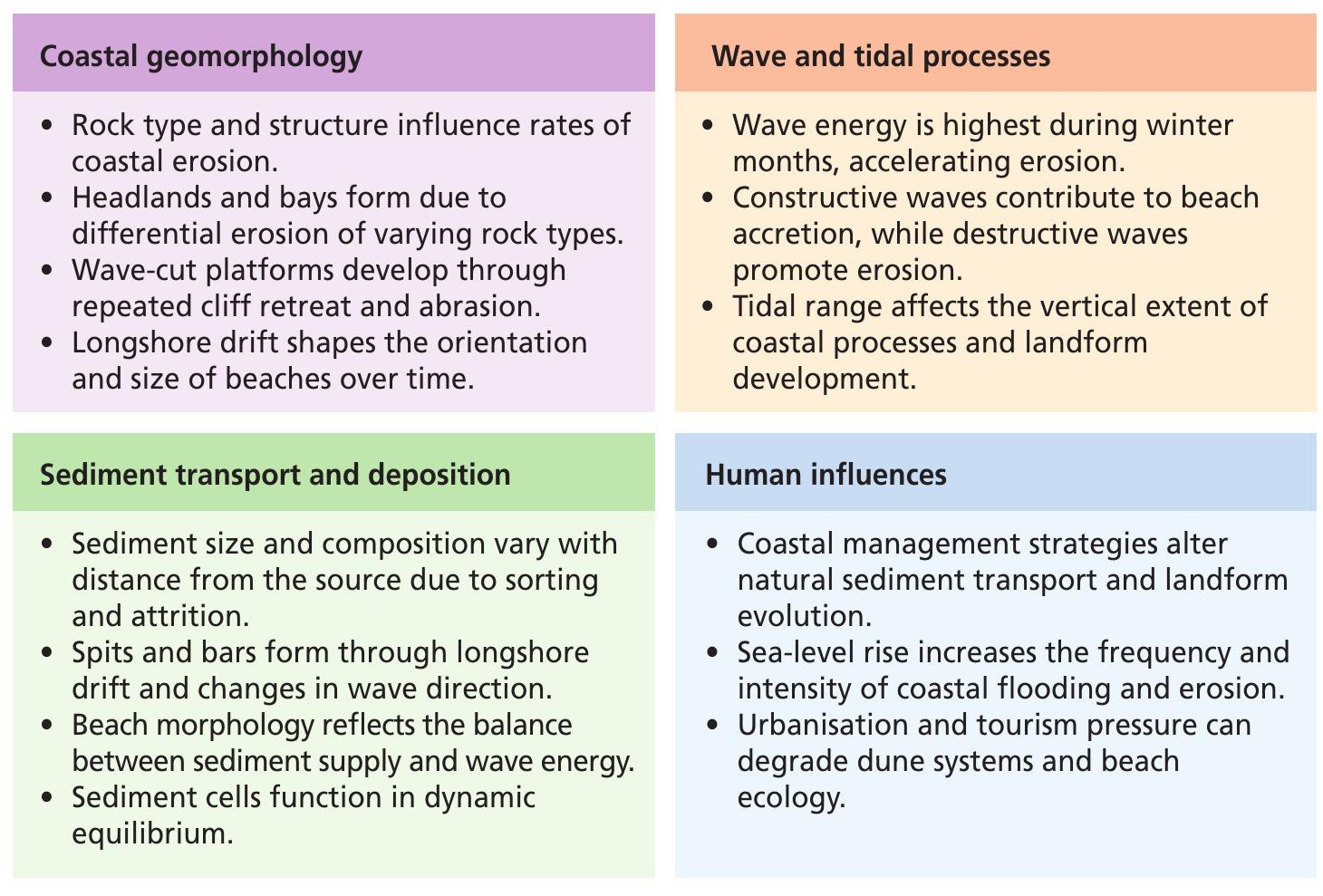 Human impacts are also a key focus, including the effectiveness of coastal management strategies like groynes and breakwaters. Comparing hard engineering with sustainable approaches across contrasting locations helps assess how well coastlines are protected and managed.
