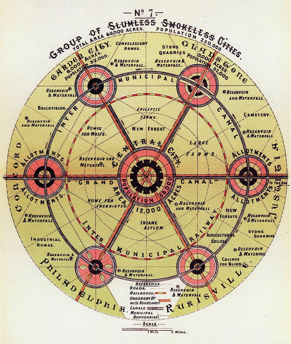 Ebeneezer Howard published ‘Tomorrow — a Peaceful Path to Real Reform’ in 1898, which became ‘Garden Cities of Tomorrow’ when it was republished in 1902. As a journalist, Howard had spent years listening to MPs debate how to improve people’s living conditions. Some of his ideas were based on what he had seen when reporting on the rebuilding of Chicago, USA, after a fire in the 1870s.