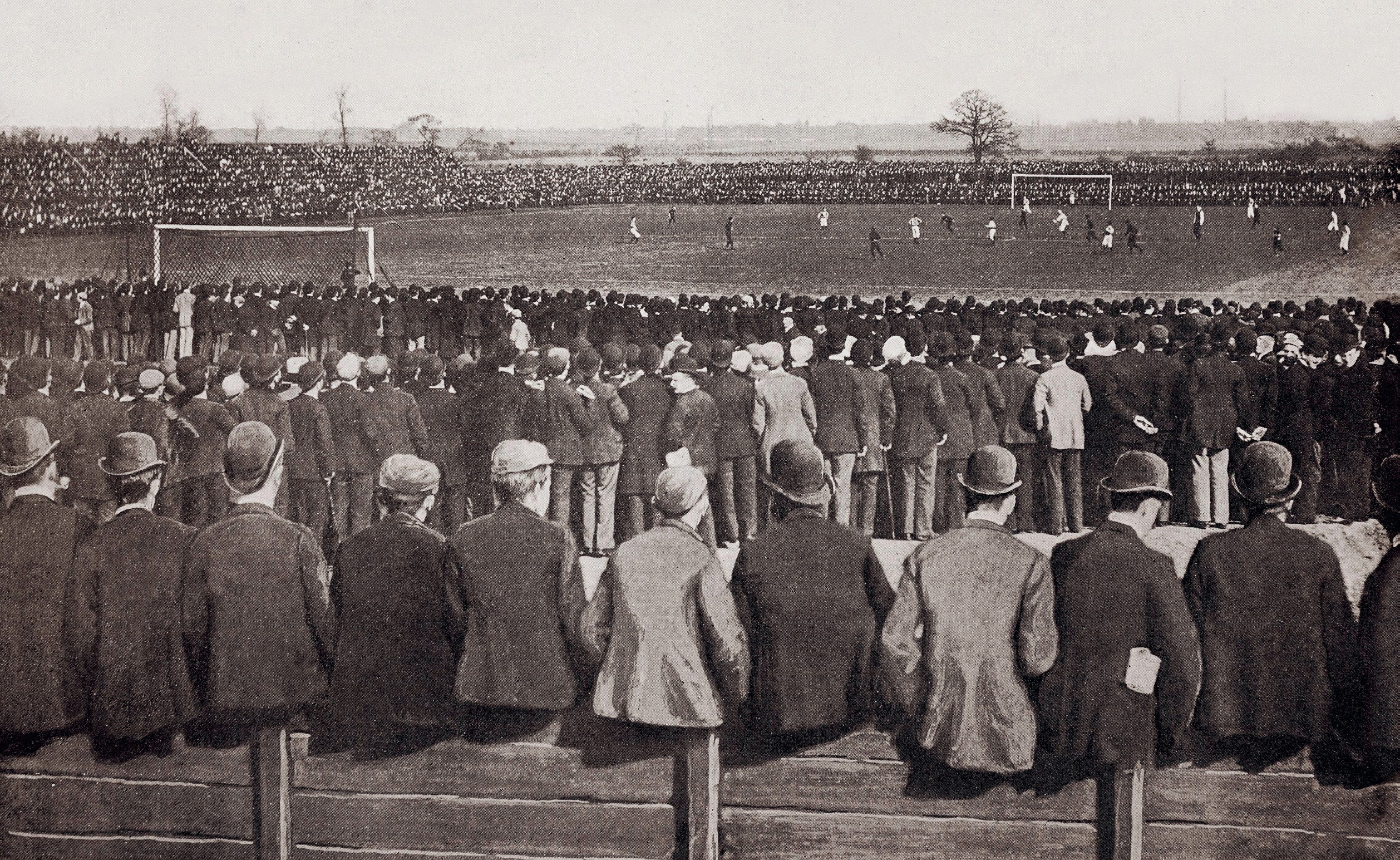Spectators at a football match in Manchester between Everton and Wolverhampton Wanderers in the late nineteenth century